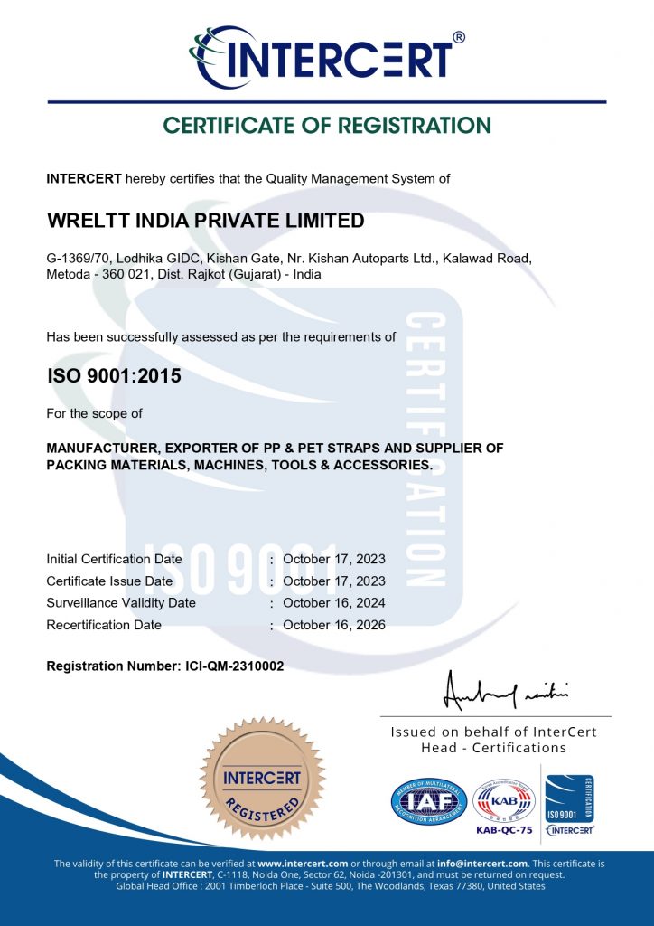 WRELTT INDIA PVT. LTD. (formerly known as Signor Polymers Pvt. Ltd.) has been established in the year 2005-06 with a vision to produce high quality Polypropylene (PP) Box Straps, ideal for Fully Semi Automatic Strapping Machine. Our Straps are available in different widths, thickness and various colors / Natural too; with an online printing facility, giving excellent printing results on the straps. Our product is manufactured on highly sophisticated, Hi-tech, imported, fully automized plant.